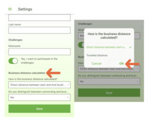 5 and 6: Go to ‘Settings’ in the app. In the second bar under ‘Business distance calculation’ you can select whether you want the app to calculate the direct distance or the traveled distance for your business trips.