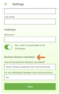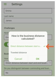 Go to Settings in the app. In the window you can choose under ‘Business distance calculation’ how the distance of your trip is calculated. (Image 6). You can select ‘The direct distance from your starting location to your work location’. This means that Thrivey tracks and saves the direct route, in kilometres, to and from your business location, without a detour.