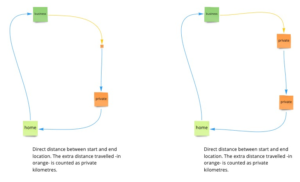 Image 2: When you travel from your home location to a private location: The kilometres you have traveled are stored in your declaration list as private kilometres.