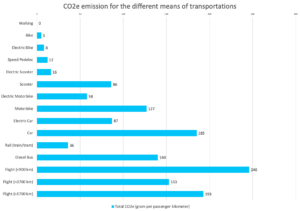 Aan de hand van de bovenstaande grafiek kun je zien dat een lijnbus of stadsbus (dit is een dieselbus) meer CO2 uitstoot dan een elektrische auto, een motor of een scooter. Het nemen van een bus blijkt dus niet altijd groener te zijn dan het rijden op een scooter! In ons onderzoek kwamen we erachter dat er twee belangrijke redenen zijn voor de onverwacht hoge CO2 uitstoot van een (diesel-)bus. Ten eerste kost de productie van de bus veel CO2. Ten tweede is de bezettingsgraad van de bus vaak laag. Dat wil zeggen: De bus zit niet altijd vol. Dat betekent dat de bus zijn maximale capaciteit niet benut, waardoor het aantal gram CO2 per passagierskilometer relatief hoog is.