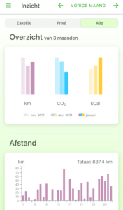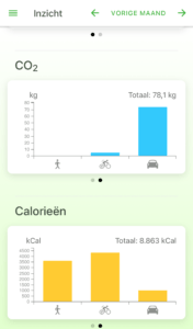 Ga in het Menu naar Inzicht. Hier zie je een Overzicht, per maand of per week, van je gemaakte kilometers, jouw CO2 uitstoot en de hoeveelheid verbrandde kCal.
