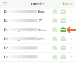 Wil je dat Thrivey de kilometers van en naar een locatie als zakelijk registreert, ga dan in het hoofdmenu naar Locaties. Er verschijnt een rij met alle locaties waar je tot dus ver bent geweest met de app. Zoek de locatie die je wilt op en druk op het koffer icoontje (rechts in beeld) om deze zakelijk te maken. Thrivey zorgt dat de zakelijke kilometers voor zowel de heen- als de terugreis juist berekend worden, ook als je via een privé locatie gaat.