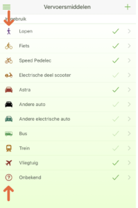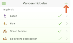 De eerste keer dat je de app opent kan je jouw vervoersmiddelen uitkiezen. Je kunt op een later tijdstip altijd meer vervoersmiddelen toevoegen. Ga in het Menu naar Vervoersmiddelen. Druk op het plus-tekentje en selecteer jouw nieuwe vervoermiddelen.
