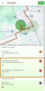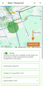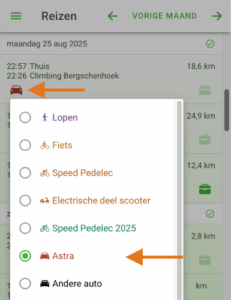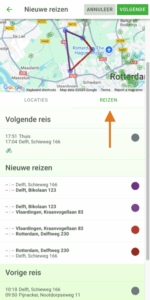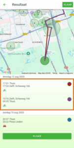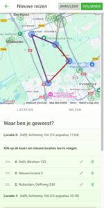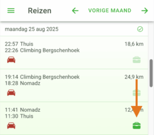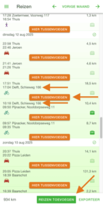 Bij je reisoverzicht zie je dat je van de ene locatie naar de andere locatie bent gereisd, met bijbehorende reistijden en het gebruikte vervoersmiddel. Door op het koffertje te drukken kan je het doel van de reis zakelijk maken. Als het vervoersmiddel niet juist is kun je een ander vervoersmiddel kiezen.