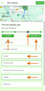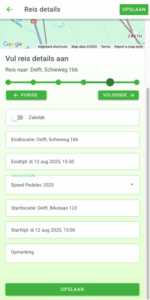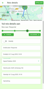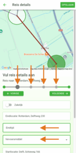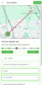 Nadat je op volgende hebt gedrukt kom je in een nieuw scherm. Hier kan je de details van de reizen toevoegen. Het is nodig om de start, eindtijd en het vervoersmiddel toe te voegen. Je zou de reizen zakelijk kunnen maken.
