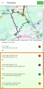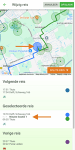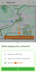 Om te splitsen druk in het ‘Reizen’ overzicht op de rit. Je komt in een venster met een kaartje met groen gelijnde route. Druk op “wijzig reis” op “Welke wijziging wilt u uitvoeren” en vervolgens op “splits route”. Sluit af met “ok”.