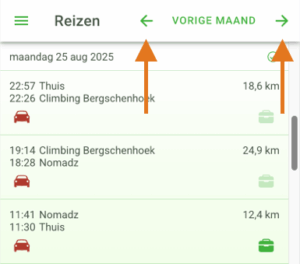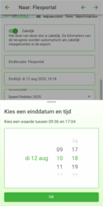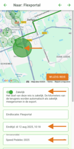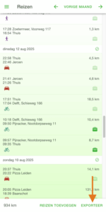 Controleer je reizen periodiek, bijvoorbeeld elke week. Zet het vervoersmiddel goed en stel in welke reizen zakelijk waren en welke niet. Bij de datum van de reizen kun je op het rondje drukken zodat er wordt opgeslagen tot wanneer je gecontroleerd hebt. Zo weet je tot hoever terug je moet gaan met controleren. Is het tijd om je kilometerdeclaratie te doen? Druk dan op exporteer (Premium functie). Je ontvangt een mailtje met een Excel overzicht van jouw gemaakte reizen van de periode die je geselecteerd hebt om te downloaden.
