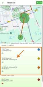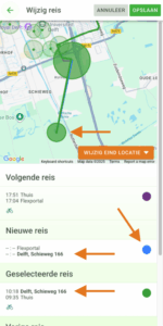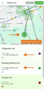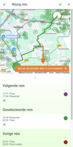 Je ziet dan ook dat de vorige of volgende reis een nieuwe start / eind locatie krijgt. Dit is omdat de reizen van Thrivey altijd opvolgend zijn. Dus de eind locatie van de vorige reis is de start locatie van de volgende reis.