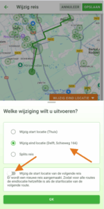 Het kan zijn dat je de reis ofwel de route wilt wijzigen. Het is mogelijk om de start en eind locatie van een reis te wijzigen. Het is ook mogelijk om de reis te splitsen. Oftewel een tussenstop toe te voegen.
