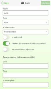 Als je met een zakelijke auto hebt gereisd wil de belastingdienst extra informatie over jouw auto krijgen. Ga in het Menu naar Vervoersmiddelen. Druk op jouw auto. In het venster dat nu verschijnt kun je alle gegevens van je auto invullen. Deze informatie wordt allemaal meegenomen in jouw exportlijst wanneer je deze download. Je kunt de volgende informatie hier invullen: