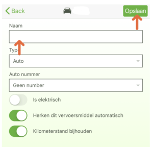 Je kan een vervoersmiddel zelf een naam geven zoals ‘Auto 2’, of ‘Huurauto’, of ‘Fiets van John’. Ga in het Menu naar Vervoersmiddelen. Druk op het vervoersmiddel waar je de naam van wilt wijzigen en typ bij ‘Naam’ de naam in.