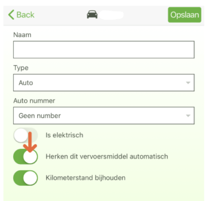 AAN: Als Thrivey het vervoersmiddel herkent, dan koppelt hij deze automatisch aan jouw reizen met dit vervoersmiddel. Ga in het Menu naar Vervoersmiddelen. Druk op een vervoersmiddel en vink in het venster van dit vervoersmiddel ‘Herken dit vervoersmiddel automatisch’ aan.