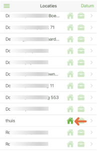 Om de thuislocatie in te stellen of te wijzigen, druk je op Locaties. Er verschijnt een lijst met alle locaties waar je tot dus ver bent geweest met de app. Zoek de locatie die je wilt op en druk op het huisje om van deze locatie jouw thuislocatie te maken.