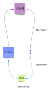 1: Als je vanuit huis naar je standplaats gaat en weer terug dan worden die kilometers als woon-werkverkeer gerekend. Ga je vanuit je standplaats naar een klant, of naar een andere zakelijke locatie en weer terug, dan geldt dat als een dienstreis.