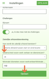 7: Om onderscheid te maken tussen woon-werkverkeer en dienstreizen ga in de app naar ‘Instellingen’. Hier zie je vlak onder ‘Zakelijke afstandsberekening’ in de tweede balk ‘Onderscheid tussen woon-werkverkeer en dienstreizen’ staan. Vink ‘Ja’ om onderscheid te maken tussen woon-werkverkeer en dienstreizen. Hieronder, bij ‘Minimale kilometers woon-werkverkeer’, kun je zelf instellen hoeveel kilometers je standaard altijd als woon-werkverkeer wilt laten meetellen.