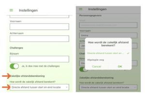 5 en 6: Ga in de app naar ‘Instellingen’. Hier kun je in de tweede balk onder ‘Zakelijke afstandsberekening’ selecteren of je wilt dat de afstand van de directe route wordt gebruikt of de afgelegde weg.